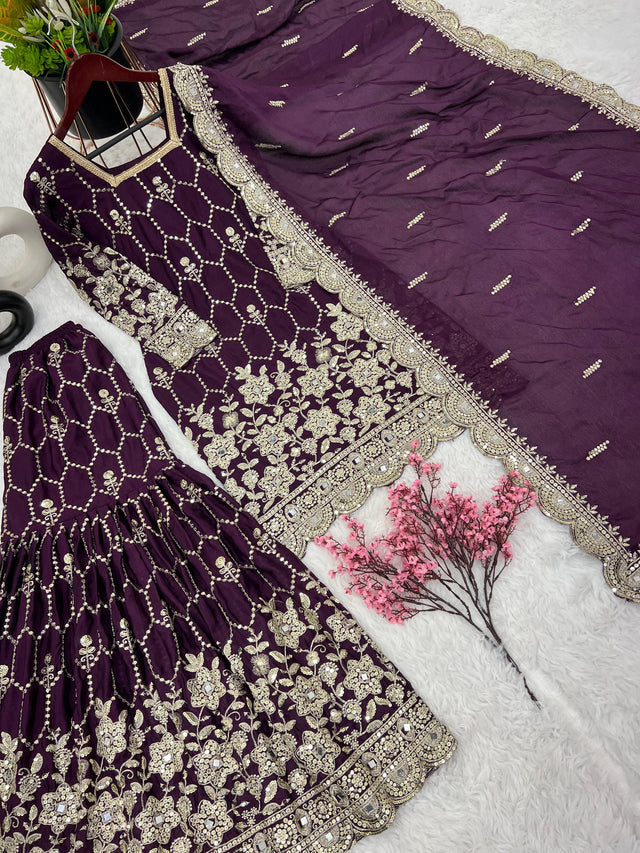 Gorgeous Embroidery Sequence Work Wine Color Sharara Suit
