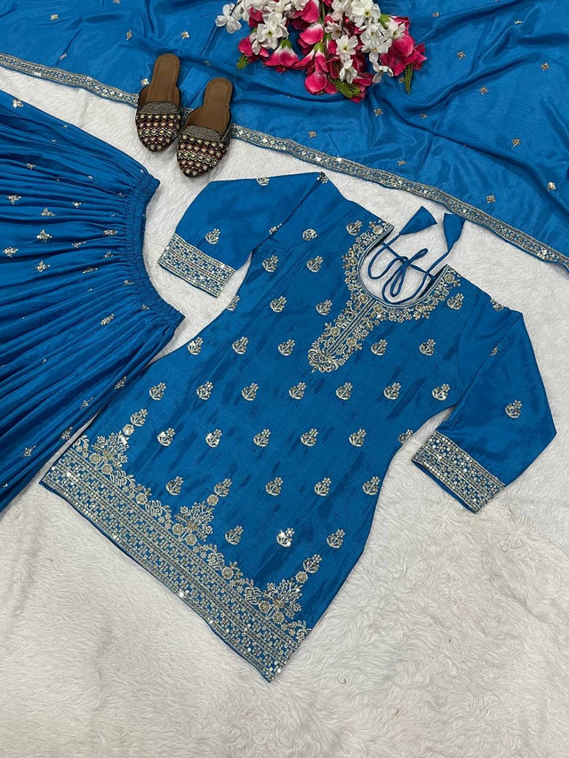 Gorgeous Sky Blue Chinnon Silk Sequence Work Sharara Suit
