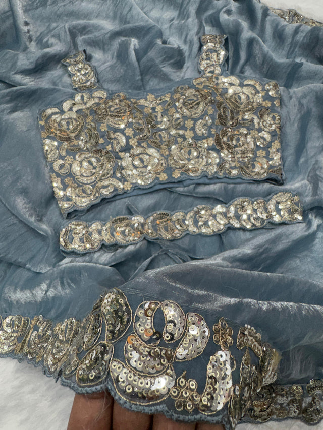 šUnveil your inner fashionista with our stunning Sky blue designer saree paired with the most sought-after Embroidery blouse in rich blue.