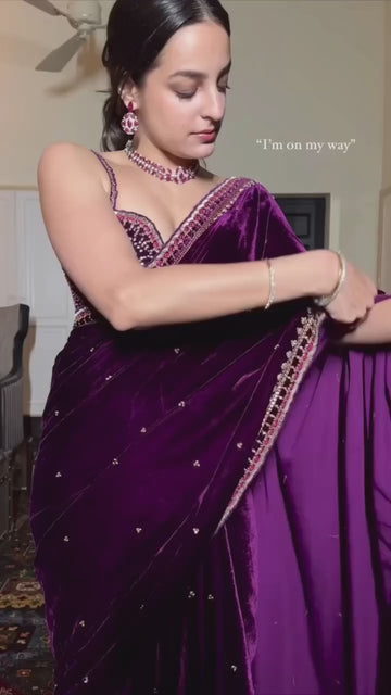 • Look: Premium heavy-work velvet saree with a rich fall and elegant shine