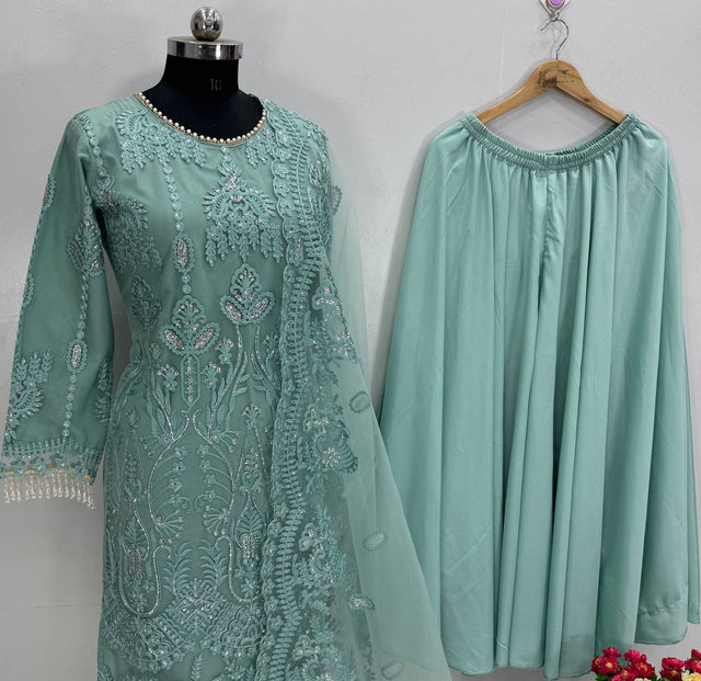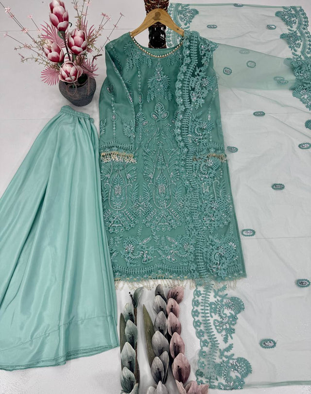 Graceful Beige Color Net Embroidery Work Palazzo Suit