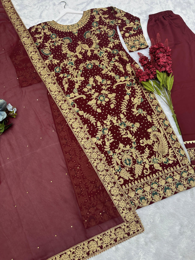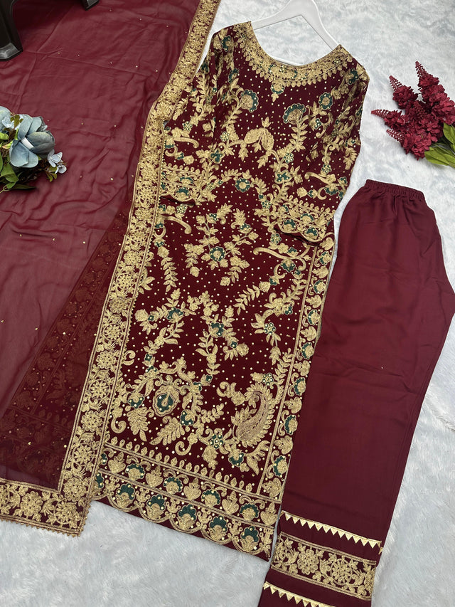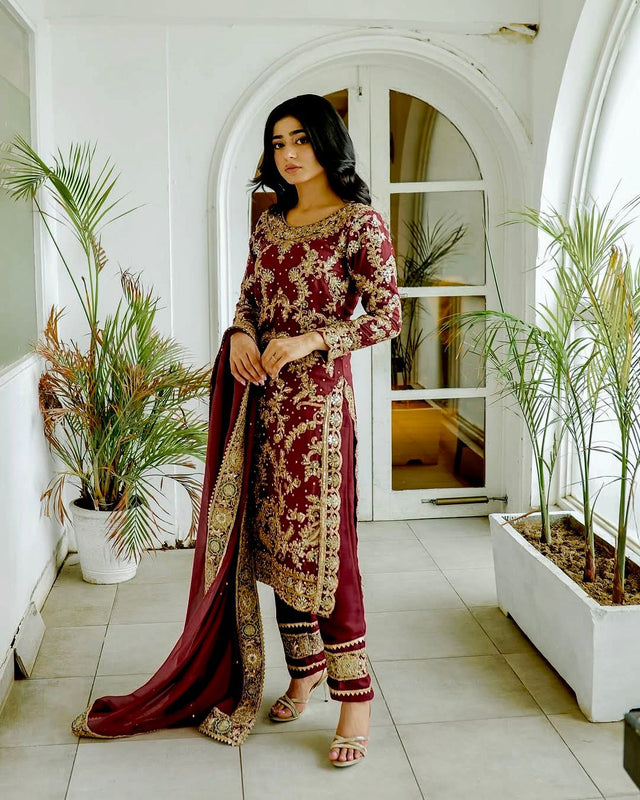Graceful Chinnon Silk Maroon Color Palazzo Suit