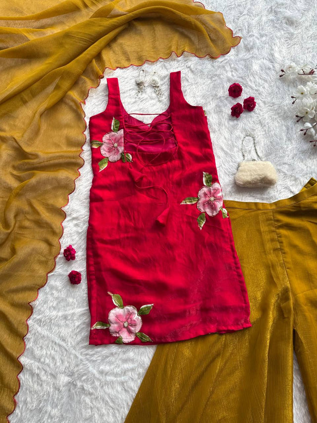 Top - Hand Paint with cut-dana handwork detailing on Fendi Silk fabric straight cut fully stitched kurta 🌸
