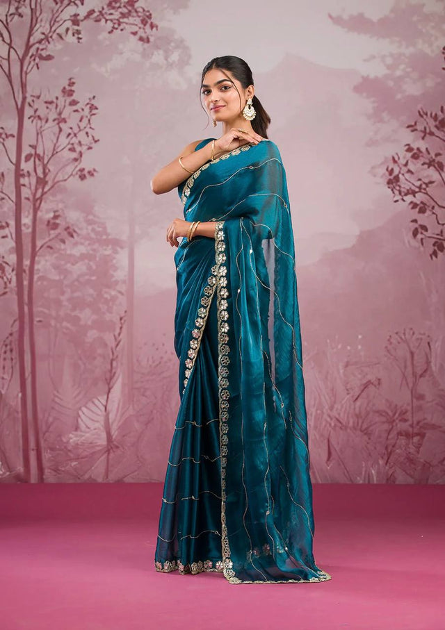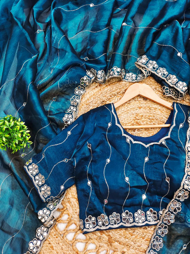 Teal Blue Color Embroidered Mirror Work Designer Saree