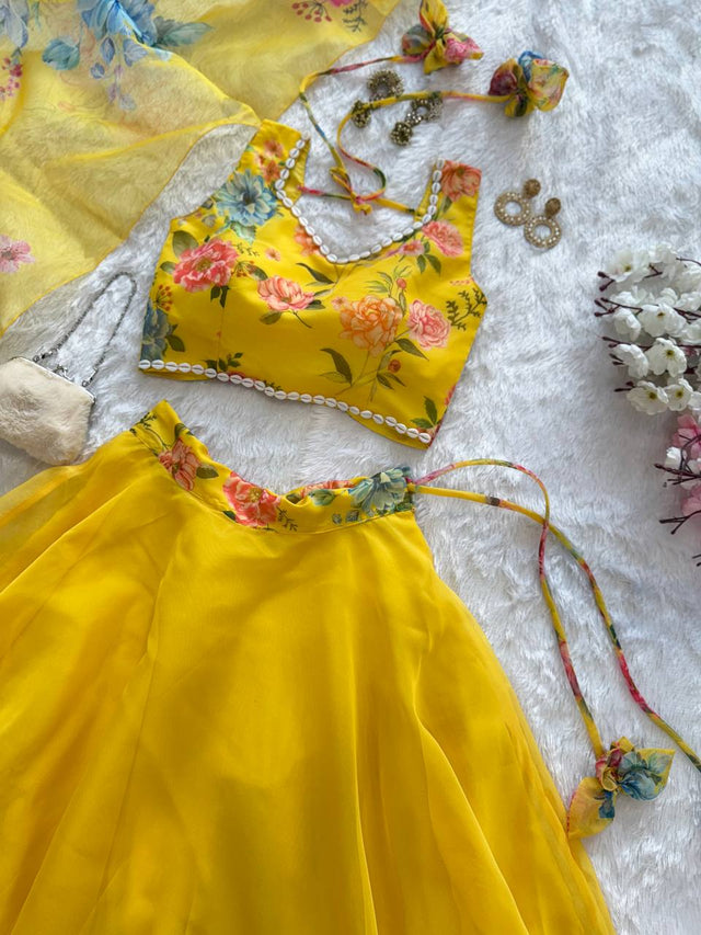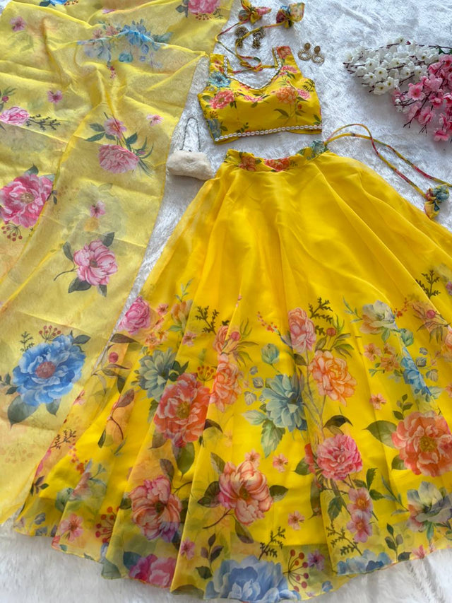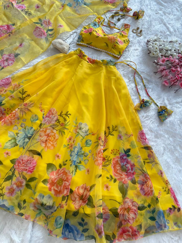 Haldi Wear Multi Flower Printed Yellow Color Lehenga Choli