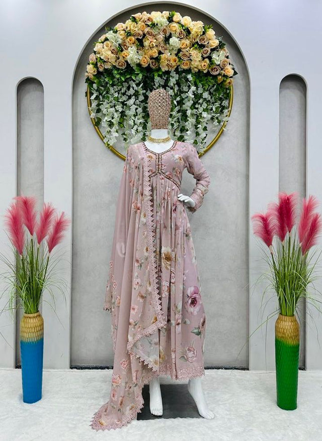 Hand Work With Digital Print Dusty Pink Color Alia Cut Gown