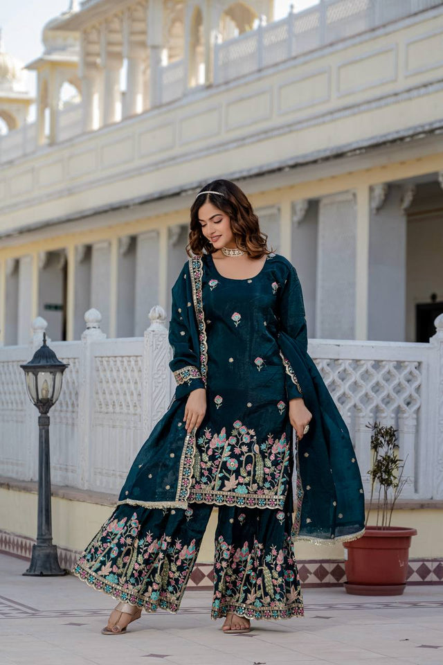 Heavy Embroidery Work Teal Green Color Shining Palazzo Suit