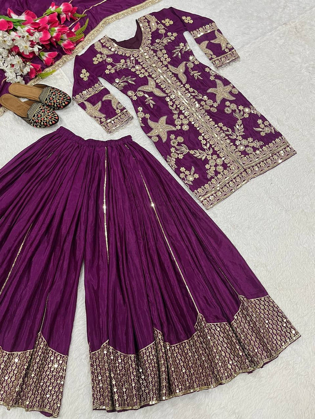 Heavy Work Wine Color Gorgeous Sharara Suit
