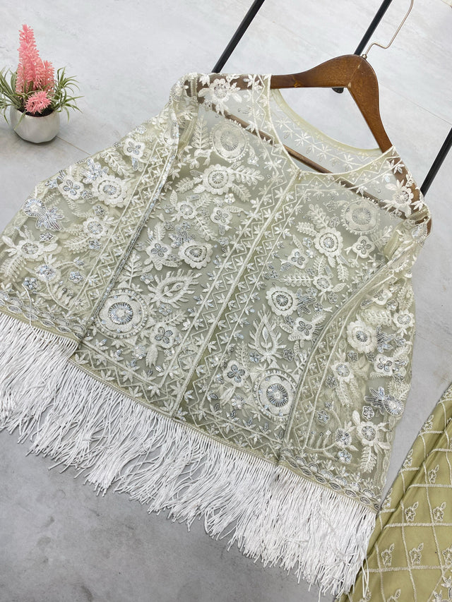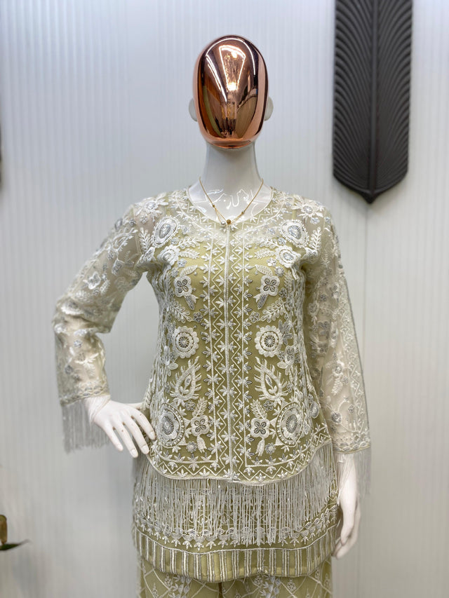 *koti: Net Fabric With Sequence Embroidery Work And Long Resa Lace