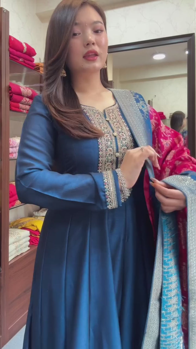 Elegant Anarkali flared kurti set crafted from premium banana silk, designed to offer a rich and graceful festive look. The kurti features a flowing flare that creates a regal silhouette, paired with intricate golden zari work on the yoke for traditional charm. Completed with a beautifully woven Banarasi silk dupatta and matching bottom wear. AD