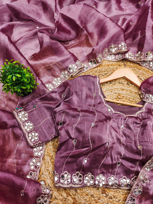 Lavender Color Embroidered Mirror Work Designer Saree