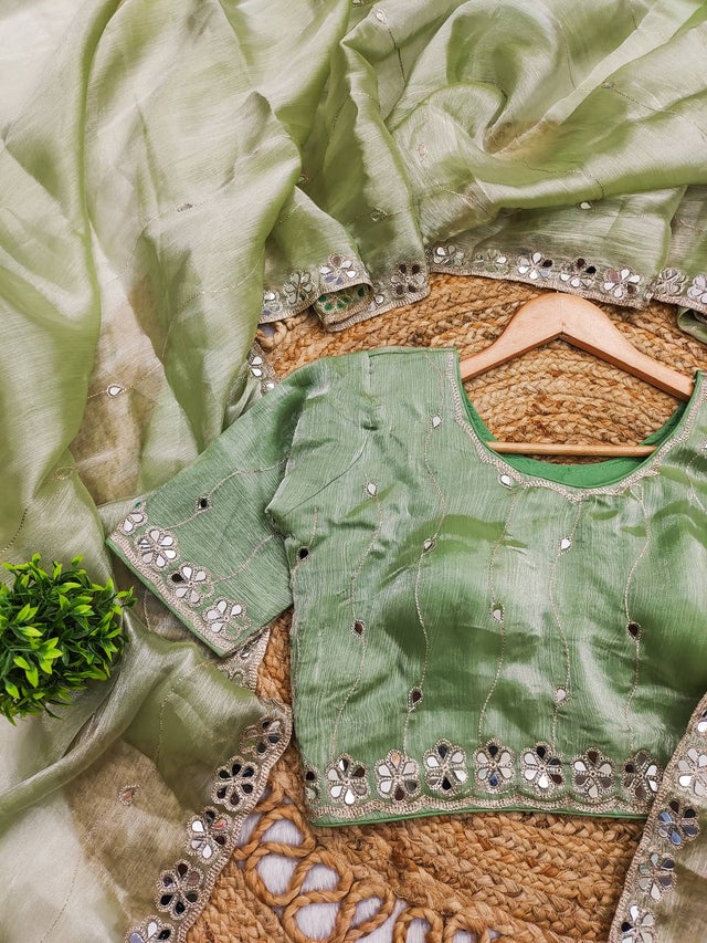🧷 Blouse : Premium Berberry With Heavy Front & Back Both Side Embroidery Work & Real Mirror 🪞 Work Unstitched Blouse