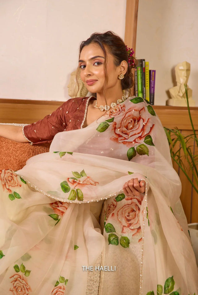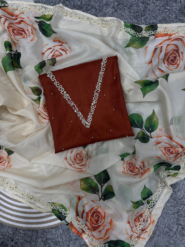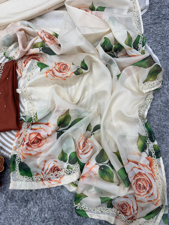 ⭕ WORK : Beautiful floral print with pearl handwork in border