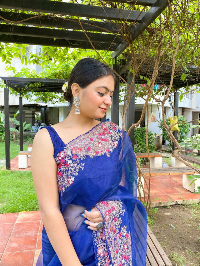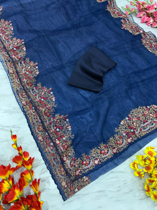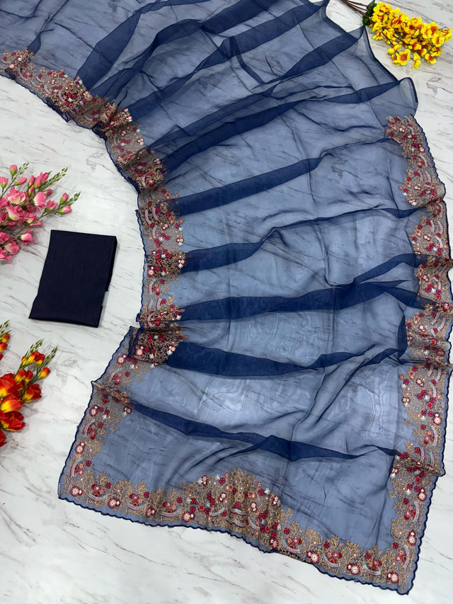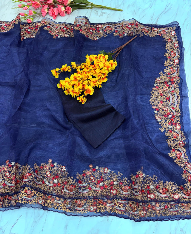 Lovely Organza Silk Navy Blue Color Saree