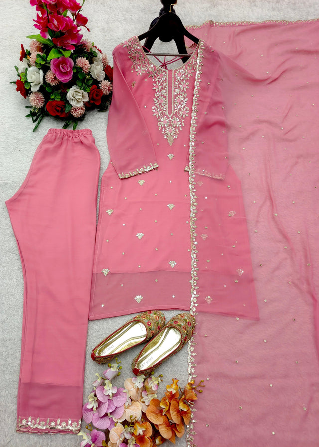 Lovely Pink Georgette Sequence Work Straight Salwar Suit