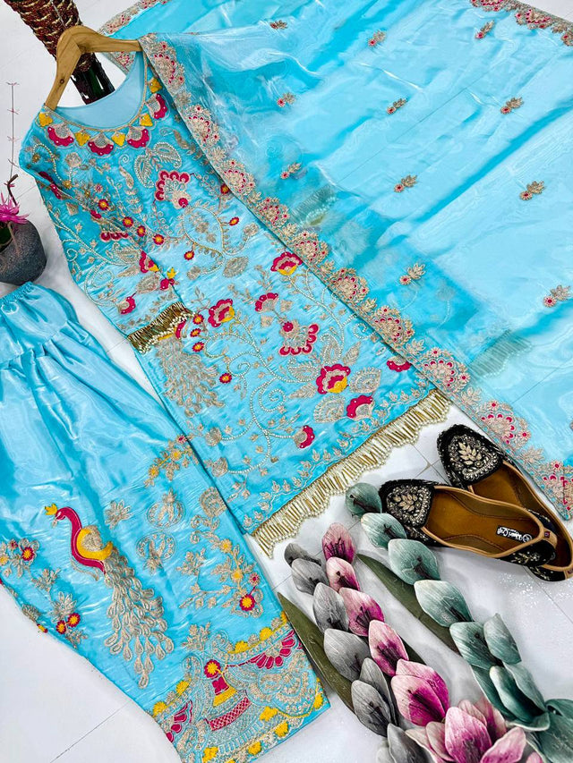 Lovely Sky Blue Color Embroidery Work Palazzo Suit
