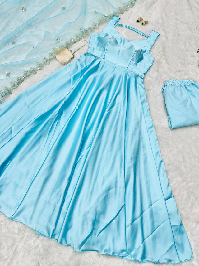 Anarkali - pure Japan Satin Anarkali suit of huge flair đ¸