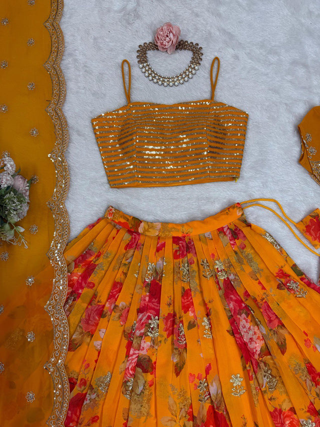 Marriage Special Digital Print Mustard Color Lehenga Choli With Koti