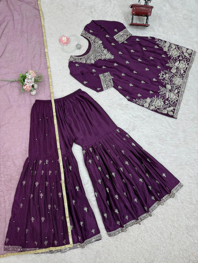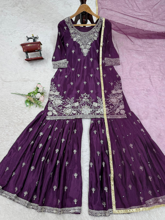 Wine Color Sequence Work Blissful Sharara Suit