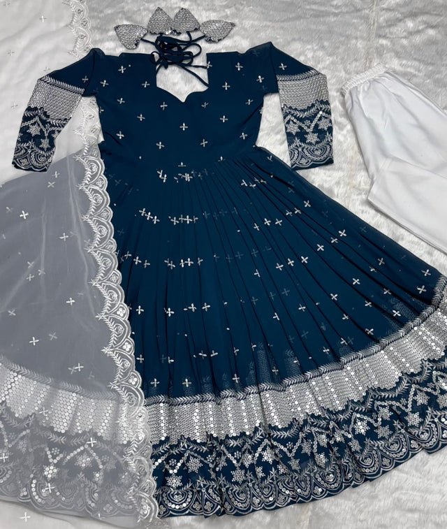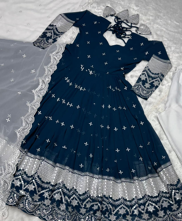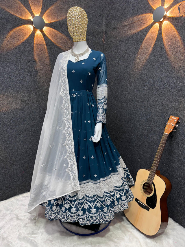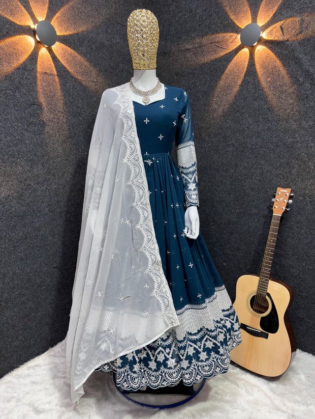 Occasion Wear Embroidery Work Blue Gown With Dupatta