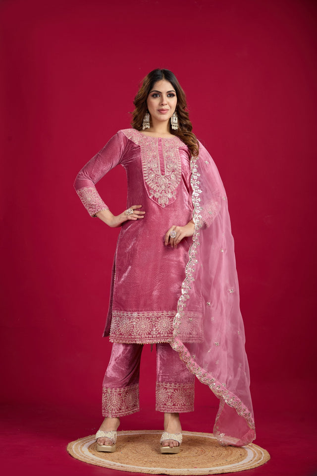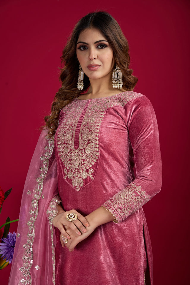 Occasion Wear Embroidery Work Pink Color Plazzo Suit