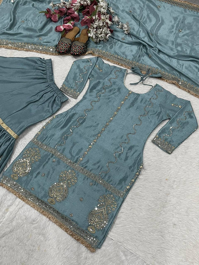Occasion Wear Embroidery Work Teal Blue Color Sharara Suit