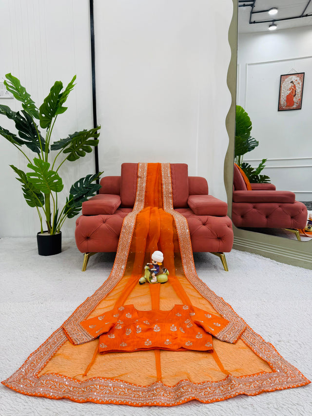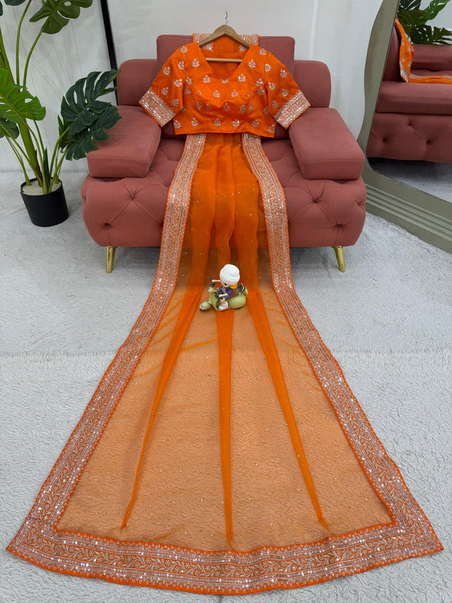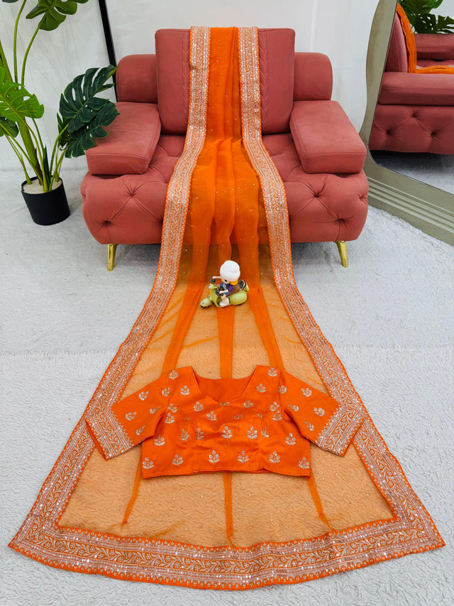 Orange Color Diamond Work Organza Silk Saree
