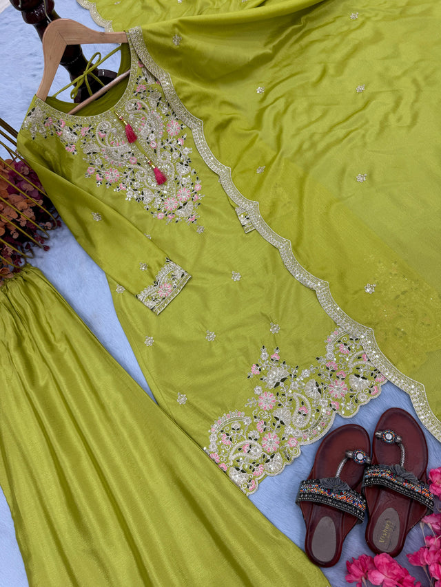 Outstanding Chinon Silk Perrot Green Color Color Palazzo Suit