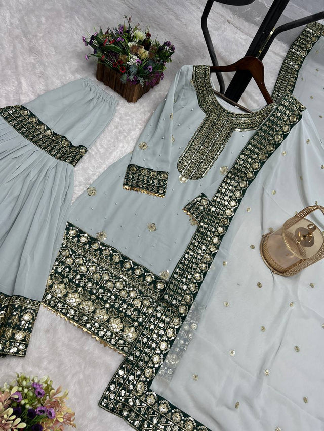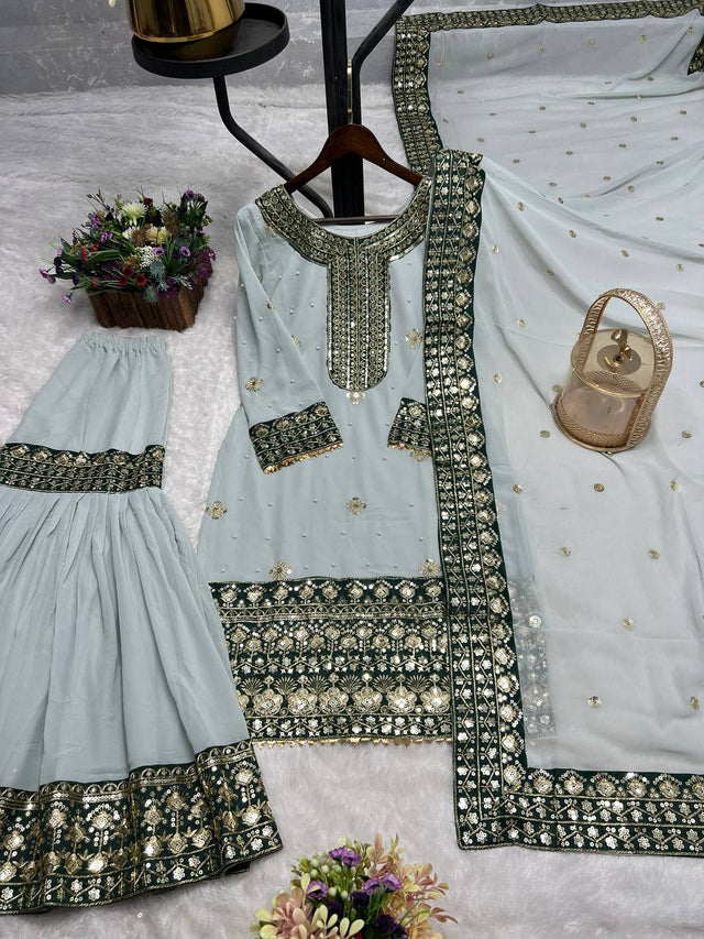 Outstanding Embroidery Work Grey Color Sharara Suit