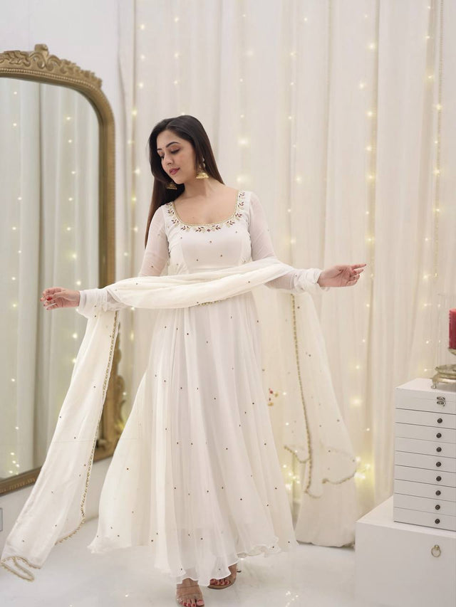 Outstanding Georgette White Color Full Sleeve Gown