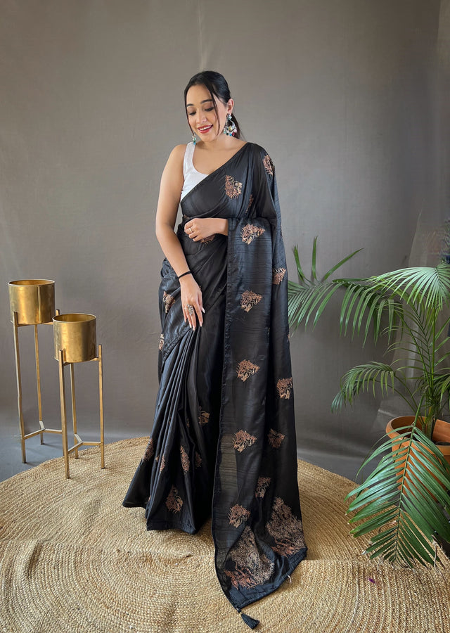 Party Wear Black Zari Based Embroidery Work Silk Saree