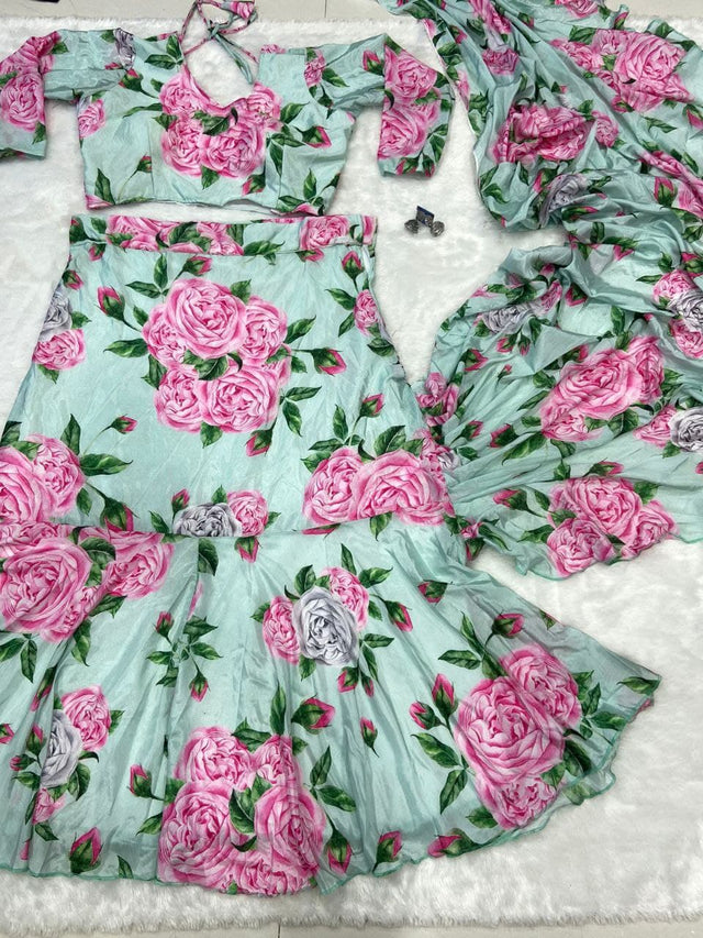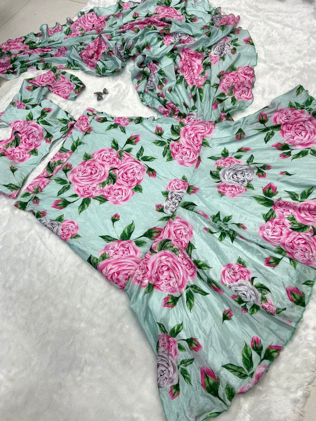 | Attached Dupatta | Premium Chinon Silk With Digital Print With Ruffles |