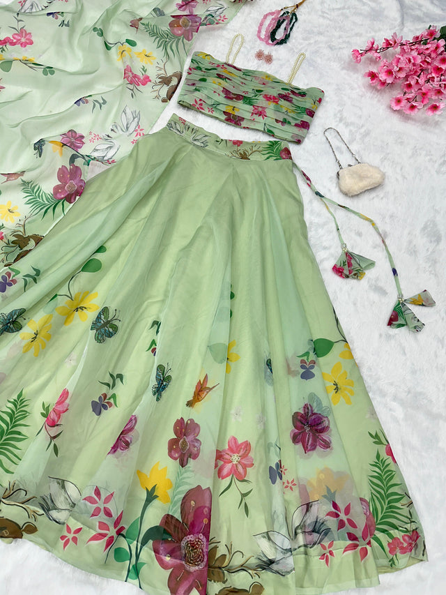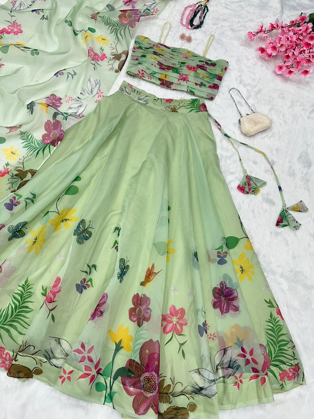 Party Wear Organza Flower Print Pista Color Lehenga Choli