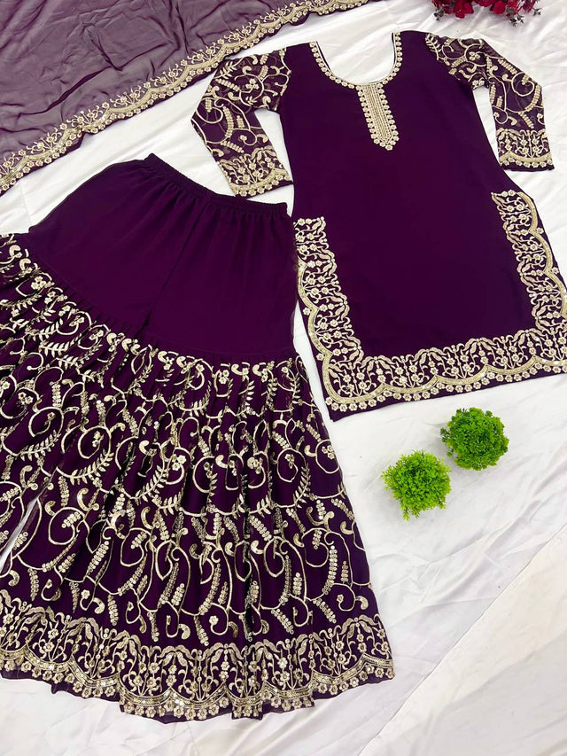 Pattern Wedding & Party Wear Sequence Work Purple Color Top Sharara With Dupatta Set
