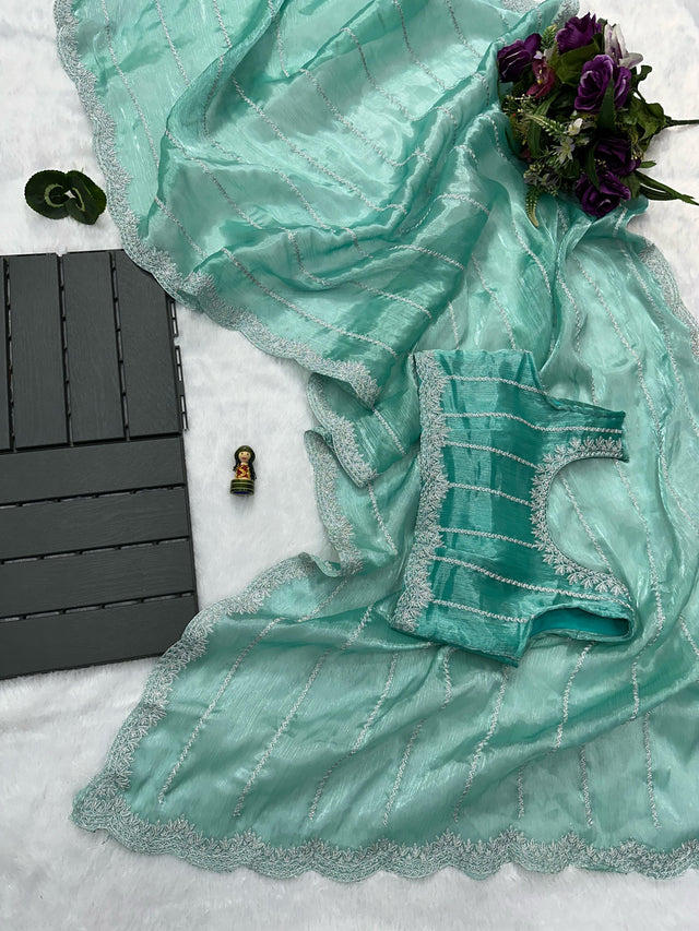 Peaceful Embroidery Zari Work Sky Blue Color Saree