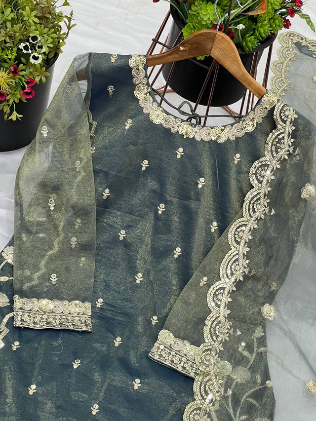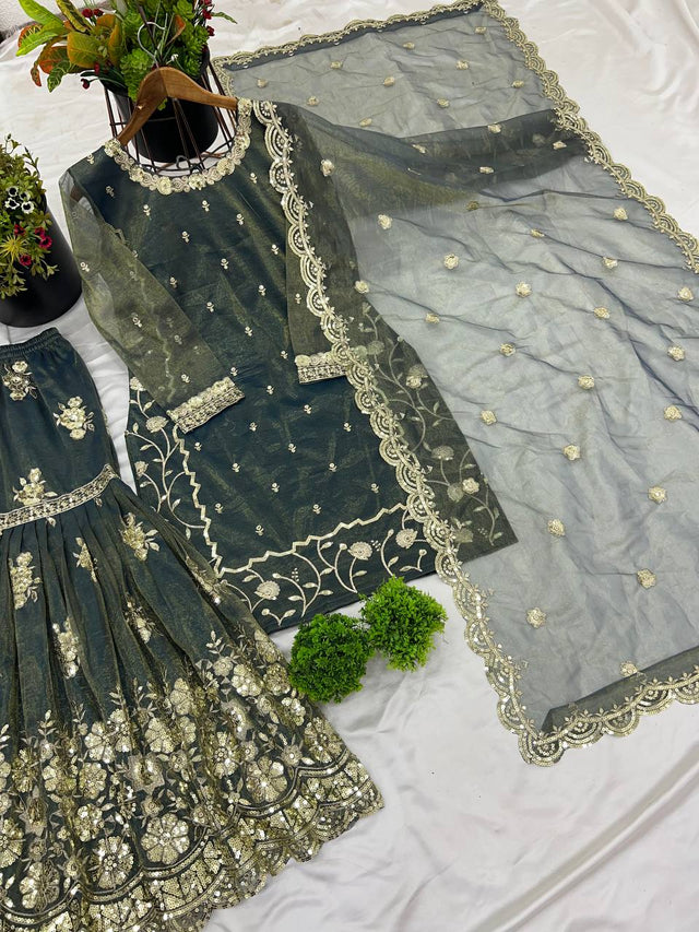 Peaceful Heavy Embroidery Work Green Color Sharara Suit
