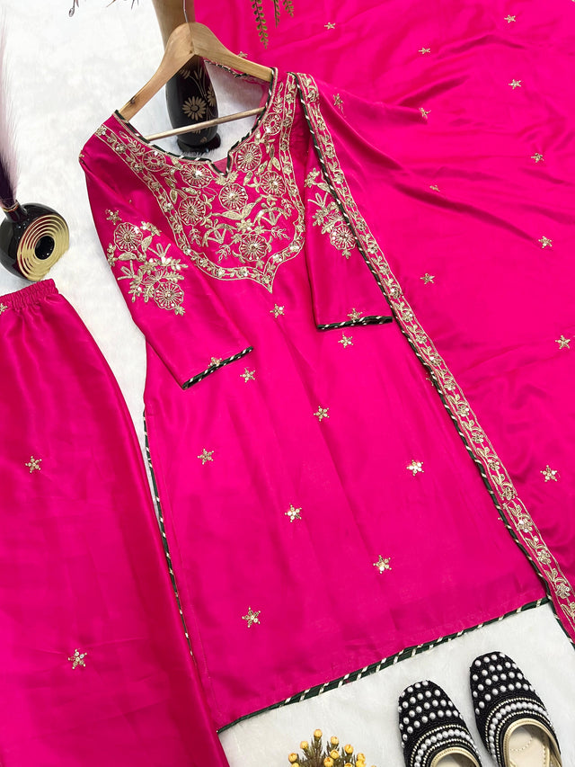 Pink Color Embroidery Work Straight Suit Set