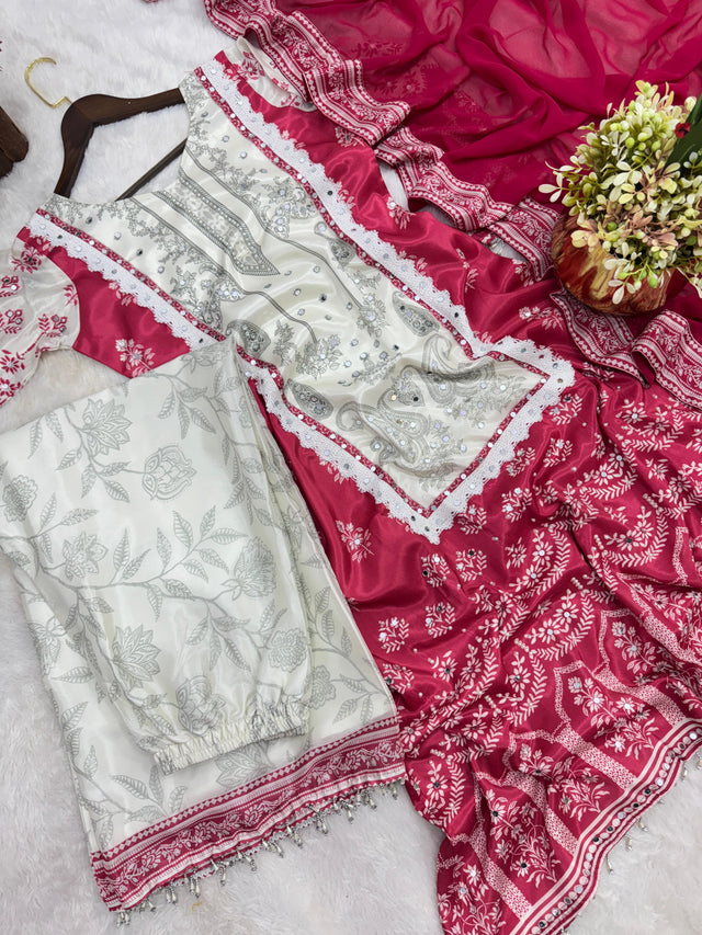 Palazzo Fabrics : Heavy Chinon Silk With Fancy Digital Print And Hanging Latkan Lace Border