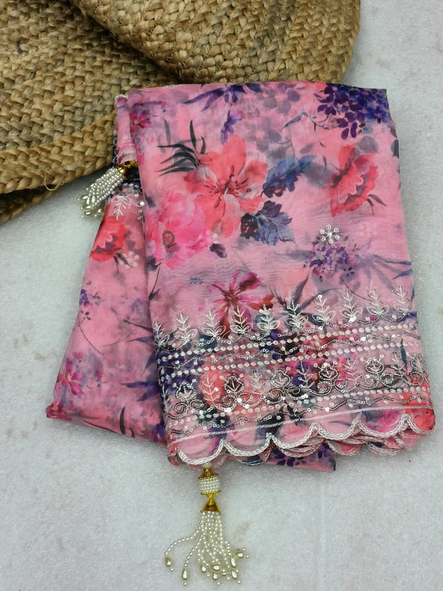 Pink Color Sequence With Cut Work Organza Saree