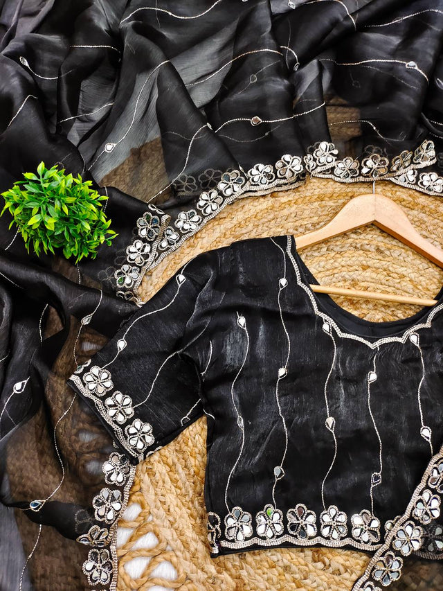 🧷 Blouse : Premium Berberry With Heavy Front & Back Both Side Embroidery Work & Real Mirror 🪞 Work Unstitched Blouse
