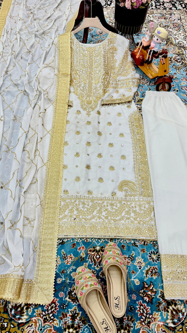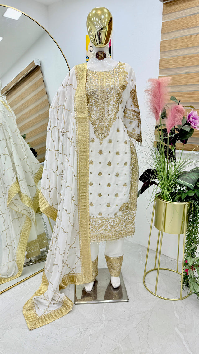 Precious Embroidery Sequence Velvet White Color Salwar Suit