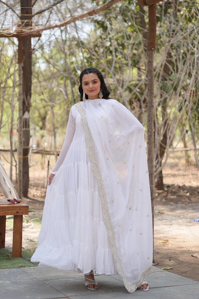 Precious White Color Ruffle Flare Gown With Heavy Dupatta