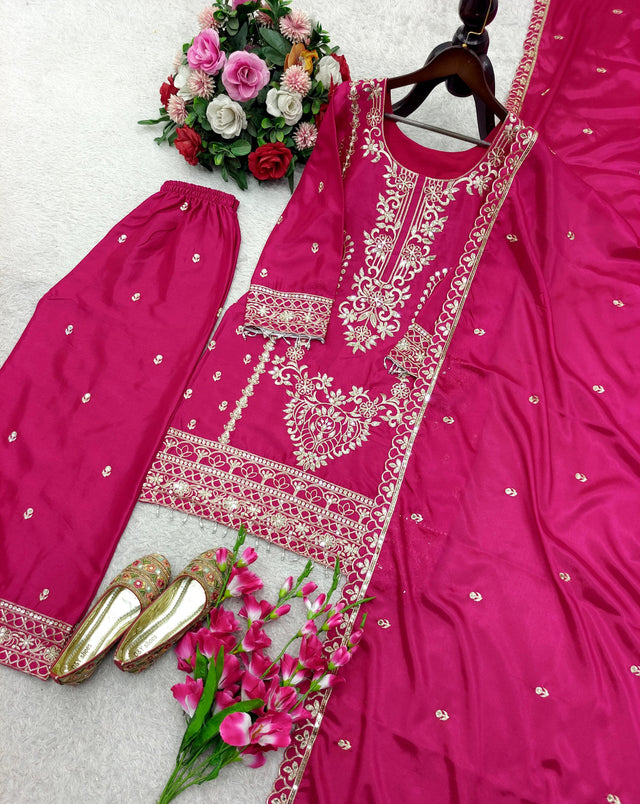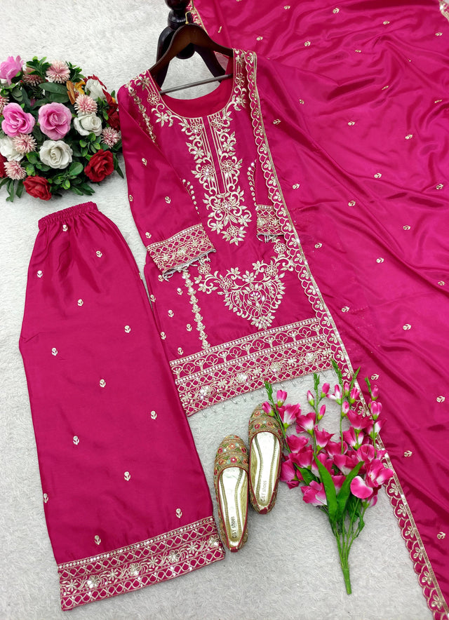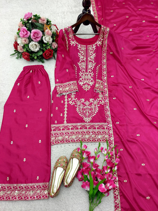 Preferable Pink Chinon Silk Embroidery Work Palazzo Suit