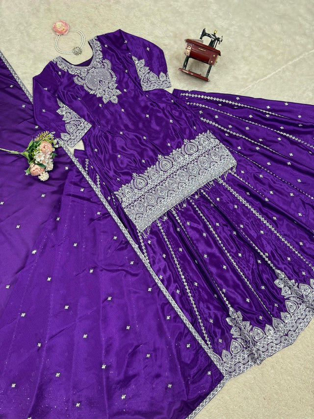 Purple Chinon Silk With Sequence Work Top With Lehenga