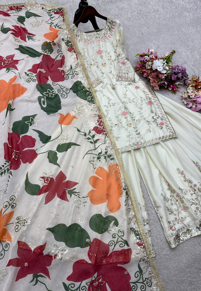 Pretty White Chinon Silk Sequence Work Sharara Suit