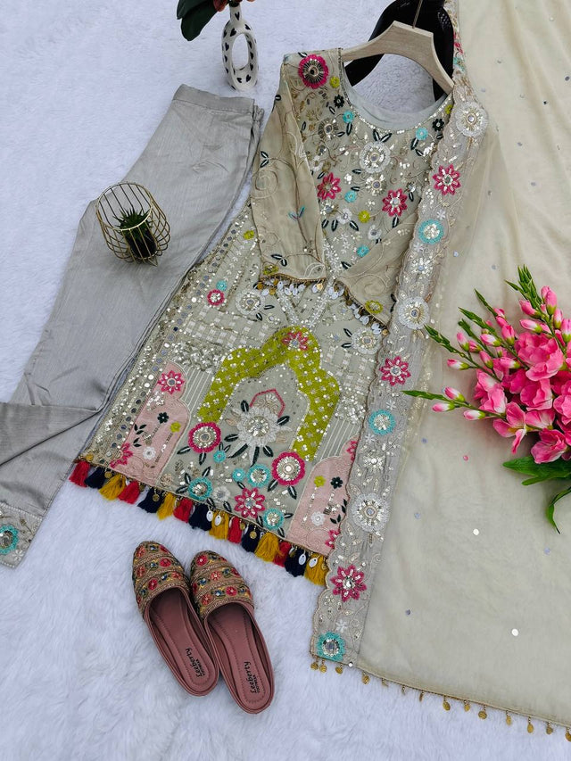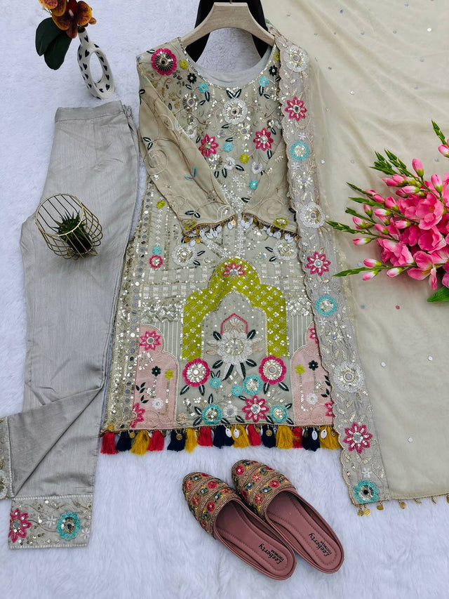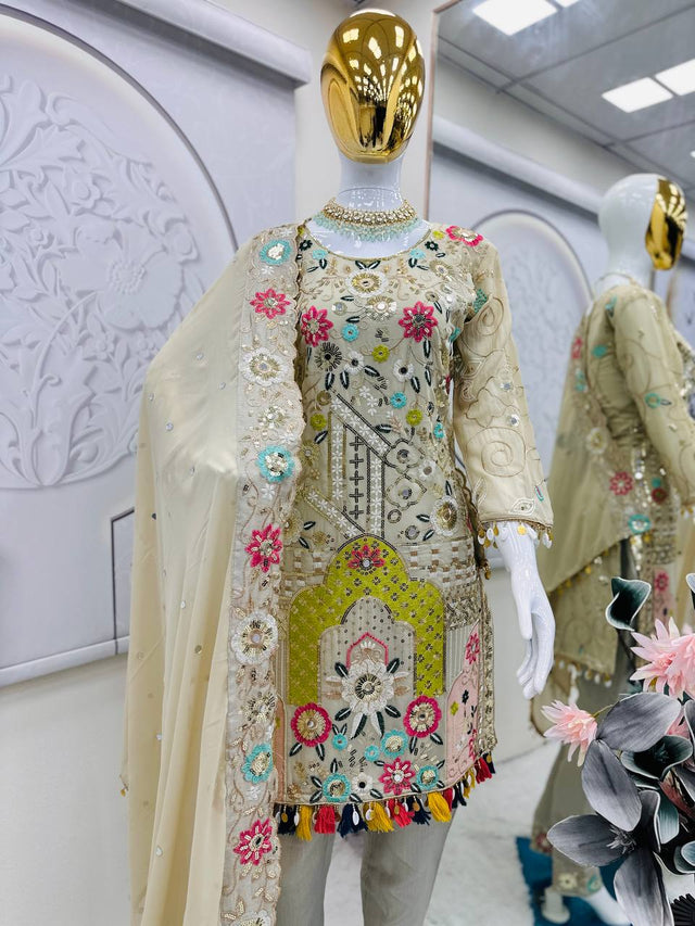 Ravishing Beige Georgette Embroidery Work Palazzo Suit