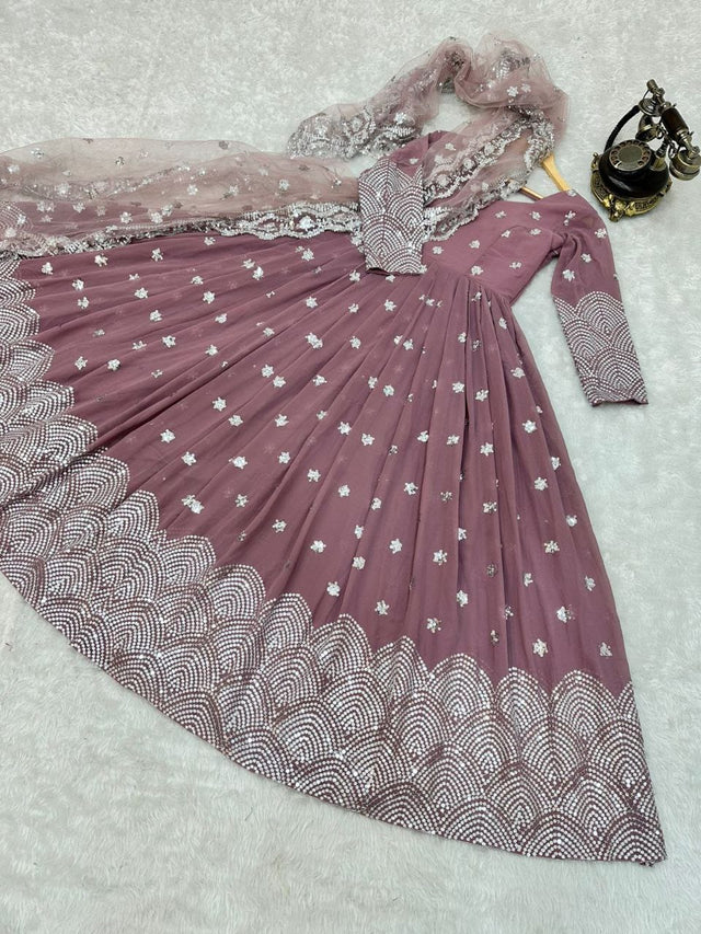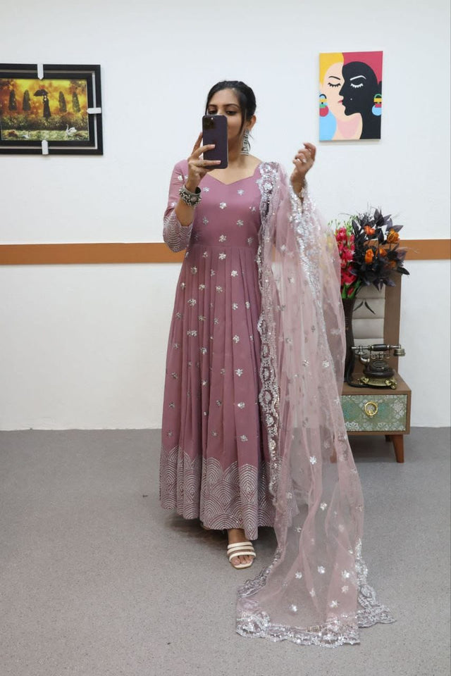 Ravishing Dusty Pink Color Embroidery Work Gown