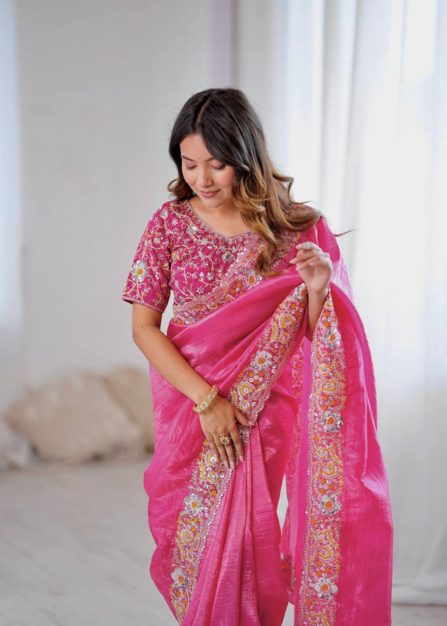 🥻 Sari Fabric: Premium Gold Crush With Heavy Embroidery Threads 🧵 Codding & Sequins Work