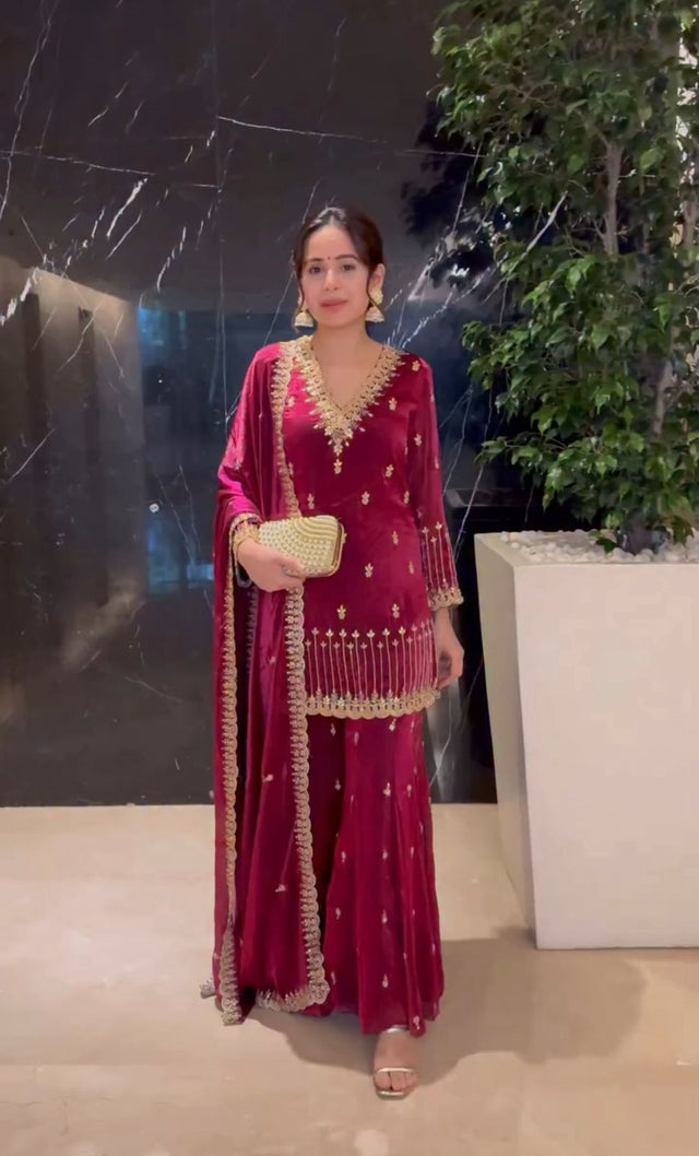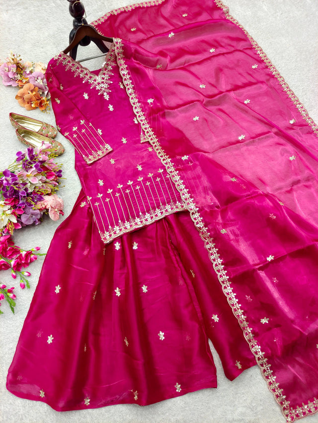 Ravishing Pink Color Embroidery Work Sharara Suit