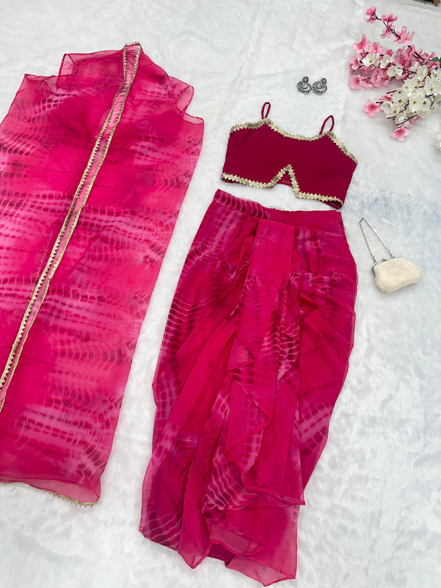 Red Color Printed Drape Style Skirt With Crop Top